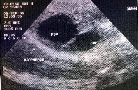 Ultrasound image of the liver from a dog with a portosystemic shunt. Note large anomalous patent ductus venous (PDV) adjacent to the caudal vena cava (CVC)